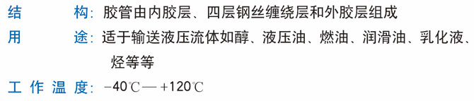 主要由耐液體的內(nèi)膠層、中膠層、2或4或6層鋼絲纏繞增強(qiáng)層、外膠層組成,內(nèi)膠層具有使輸送介質(zhì)承受壓力,保護(hù)鋼絲不受侵蝕的作用,外膠層保護(hù)鋼絲不受損傷,鋼絲(φ0.3--2.0增強(qiáng)鋼絲)層是骨架材料起增強(qiáng)作用。