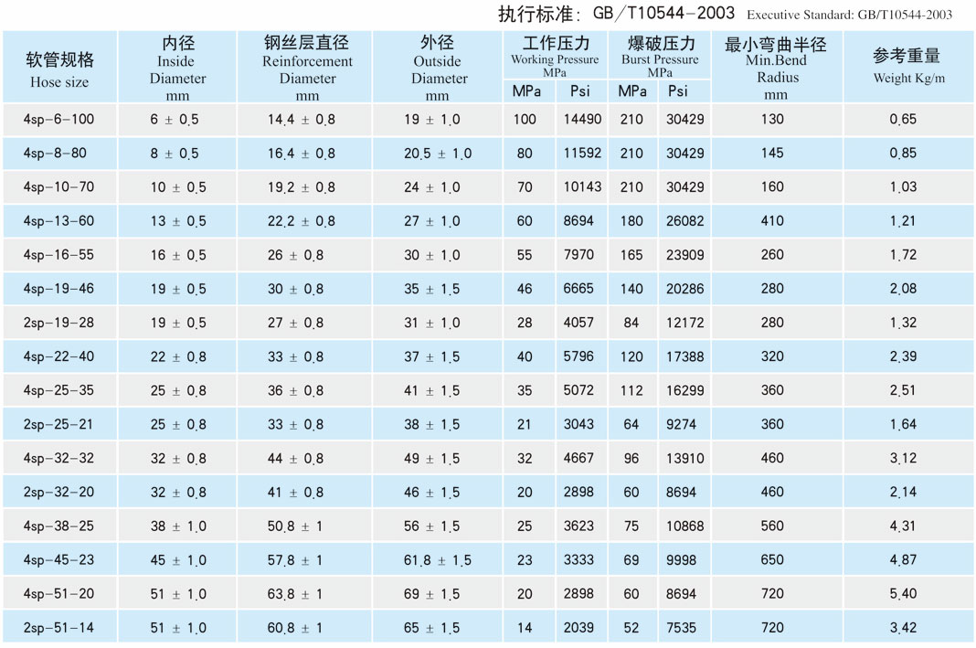 注:本企業(yè)鋼絲纏繞膠管標(biāo)準(zhǔn)參照GB/T10544-03標(biāo)準(zhǔn),DIN20023,SAE100R9~13標(biāo)準(zhǔn),本標(biāo)準(zhǔn)不適合蓖麻油基和脂基液體。